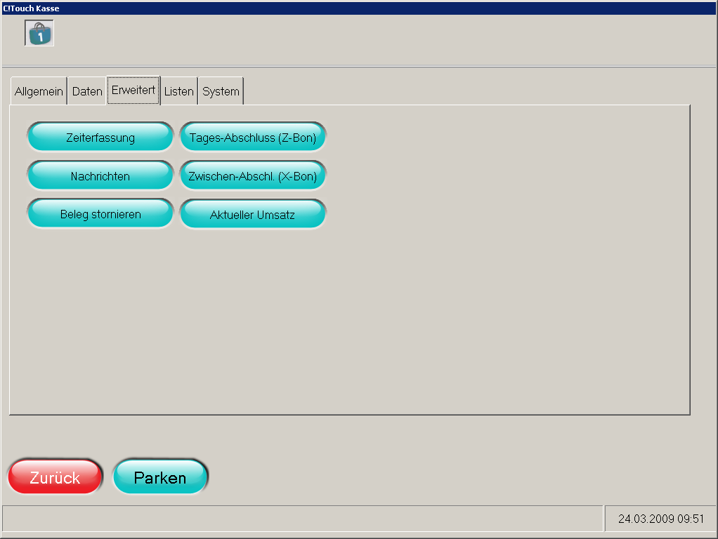 Tippen Sie zur Durchführung eines Tagesabschlusses auf den Button „Funktion“, dann auf die Registerkarte „Erweitert“ (s. Abb.) und „Tages-Abschluss (Z-Bon)“.