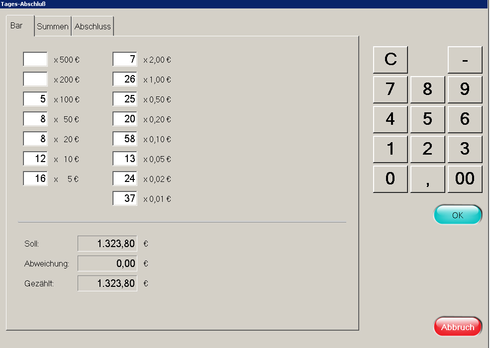 Geben Sie anschließend in der „Zählmaske“ das gezählte Bargeld ein und wechseln Sie dann von der Registerkarte „Bar“ in „Summen“ (s. nächste Abb.).